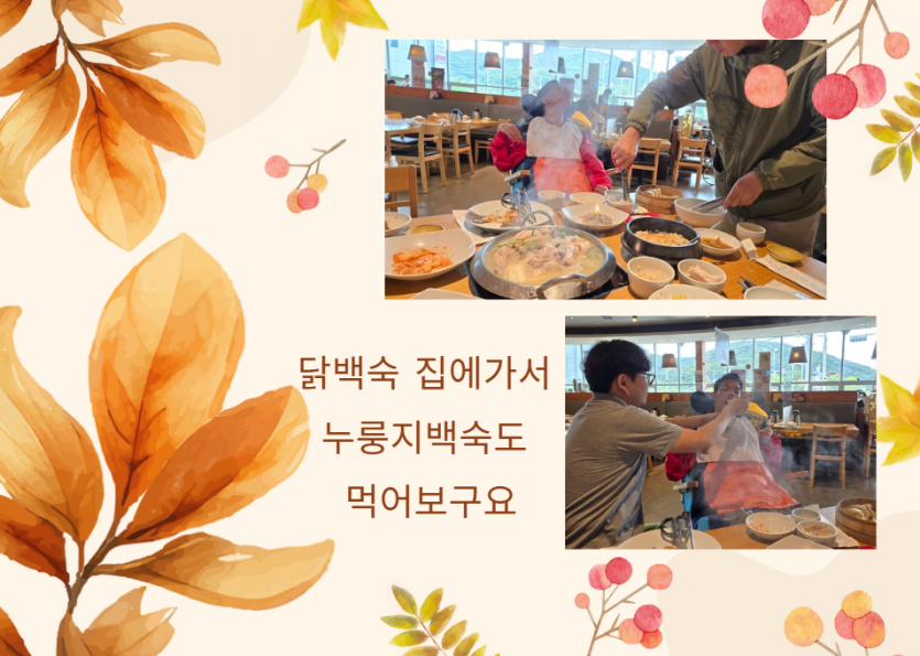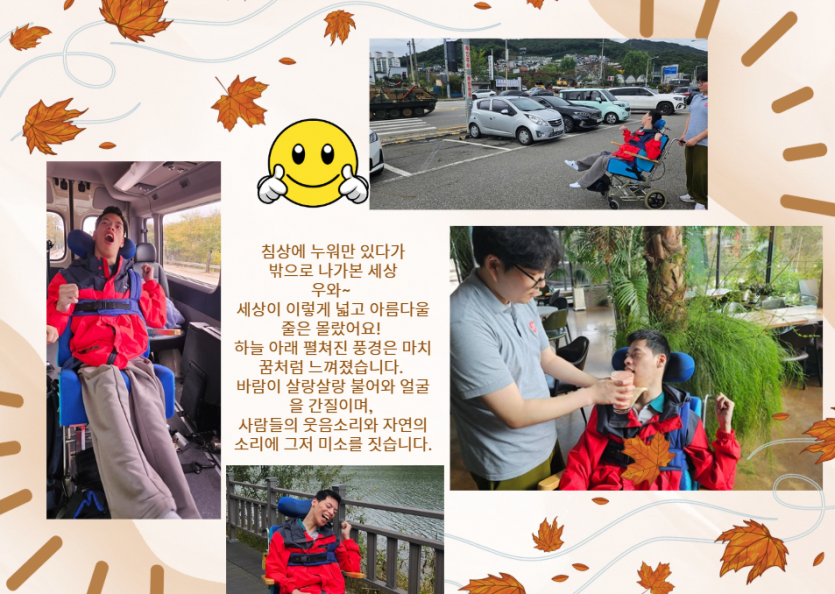 거주인 이야기 | 2025 와상 가족 나들이 페이지 정보 작성자 장설궁 작성일 25-10-30 09:41 조회 2,246회 댓글 0건 본문 와상가족나들이 침상에서만 지내다 첫 외출을 합니다.선생님들과 함께 바깥으로 나서는 순간, 상쾌한 바람이 얼굴을 스치니 웃음이 절로 납니다.오랜만에 보는 주변의 풍경은 새롭게만 느껴집니다.오늘의 나들이는 오래도록 기억될 소중한 시간이 되었습니다. 감사합니다. 이전글 다음글 목록