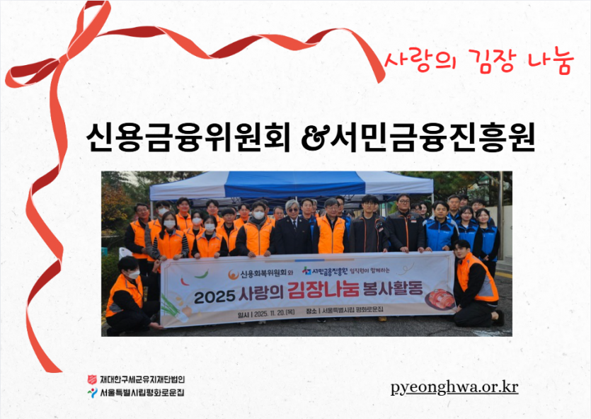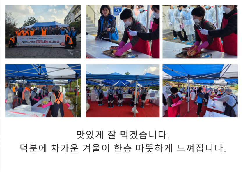 후원자·봉사자 이야기 | 신용회복위원회와 서민금융진흥원과 함께 하는 김장 페이지 정보 작성자 장설궁 작성일 25-11-26 11:16 조회 1,848회 댓글 0건 본문 신용회복위원회와 서민금융진흥원과 함께한 김장임직원분들께서 직접 김치를 담으며 가족분들이 겨울에 맛있게 드신다는 생각에 한 포기 한 포기 정성을 담아따뜻한 마음을 전해주셨습니다. 이 김치가 식탁에 오를 때마다 사랑이 깃든 이 따스함을잊지 않겠습니다. 함께해 주신 모든 분들께 다시 한 번 깊은 감사를 드립니다.고맙습니다.감사합니다. 이전글 다음글 목록