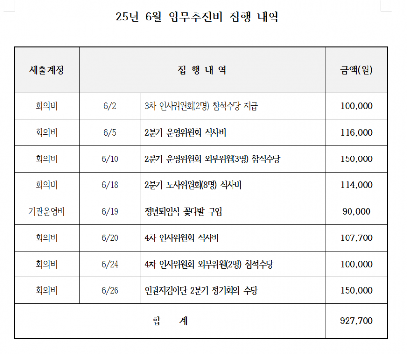 6월 업무추진비 내역공고 페이지 정보 작성자 한동주 작성일 25-07-04 17:35 조회 8,731회 댓글 0건 본문 6월 업무추진비를 다음과 같이 공고합니다. 이전글 다음글 목록 답변