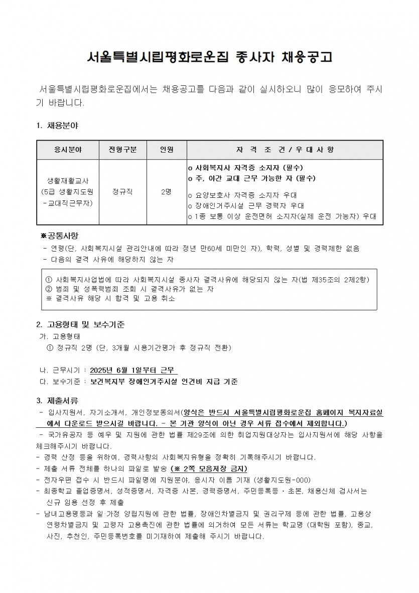 평화로운집 2025년 3차 종사자(생활지도원) 채용 공고 페이지 정보 작성자 한동주 작성일 25-05-02 14:08 조회 11,069회 댓글 0건 첨부파일 파일 2025년-생활지도원 3차.hwp (114.5K) 97회 다운로드 DATE : 2025-05-02 14:08:29 파일 시립평화로운집 입사지원서이력서,자기소개서및개인정보동의서.hwp (54.0K) 149회 다운로드 DATE : 2025-05-02 14:08:29 본문 평화로운집 2025년 3차 종사자(생활지도원) 채용을 다음과 같이 공고합니다. 이전글 다음글 목록 답변