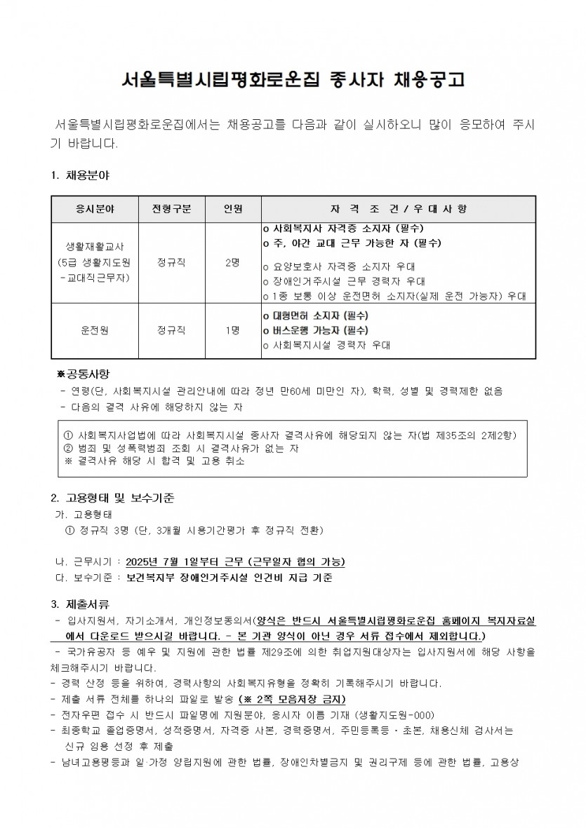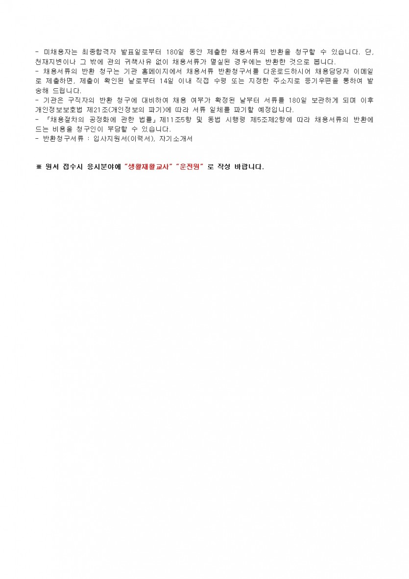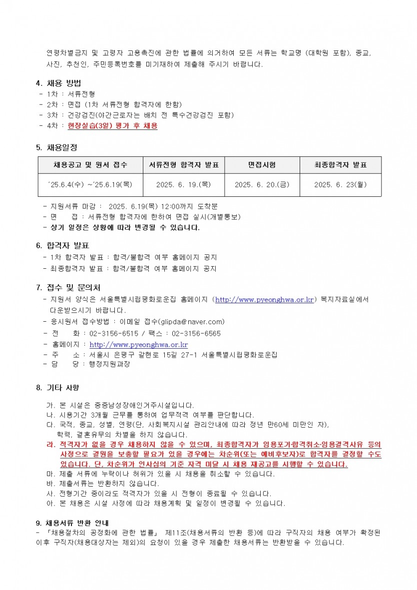 제4차 직원채용 공고(생활지도원, 운전원) 페이지 정보 작성자 한동주 작성일 25-06-04 13:54 조회 10,127회 댓글 0건 첨부파일 파일 시립평화로운집 입사지원서이력서,자기소개서및개인정보동의서.hwp (54.0K) 159회 다운로드 DATE : 2025-06-04 13:54:21 파일 2025년 4차 운전원, 생활지도원.hwp (117.5K) 131회 다운로드 DATE : 2025-06-04 16:44:36 본문 이전글 다음글 목록 답변