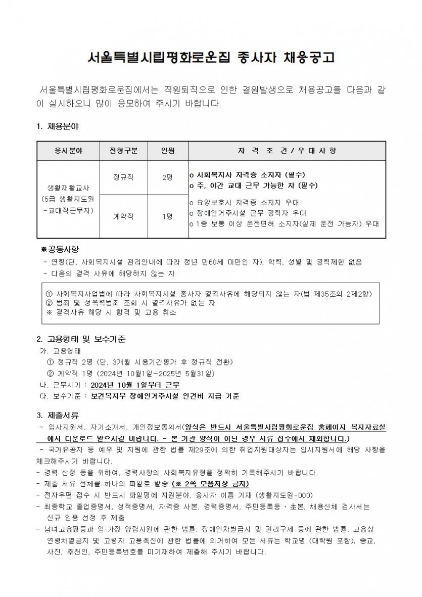 2024년 제9차 종사자 채용 모집공고 페이지 정보 작성자 한동주 작성일 24-09-04 17:18 조회 17,877회 댓글 0건 첨부파일 파일 시립평화로운집 입사지원서이력서,자기소개서및개인정보동의서.hwp (22.5K) 132회 다운로드 DATE : 2024-09-04 17:18:55 파일 2024년-생활지도원 9월.hwp (36.5K) 109회 다운로드 DATE : 2024-09-04 17:18:55 본문 이전글 다음글 목록 답변