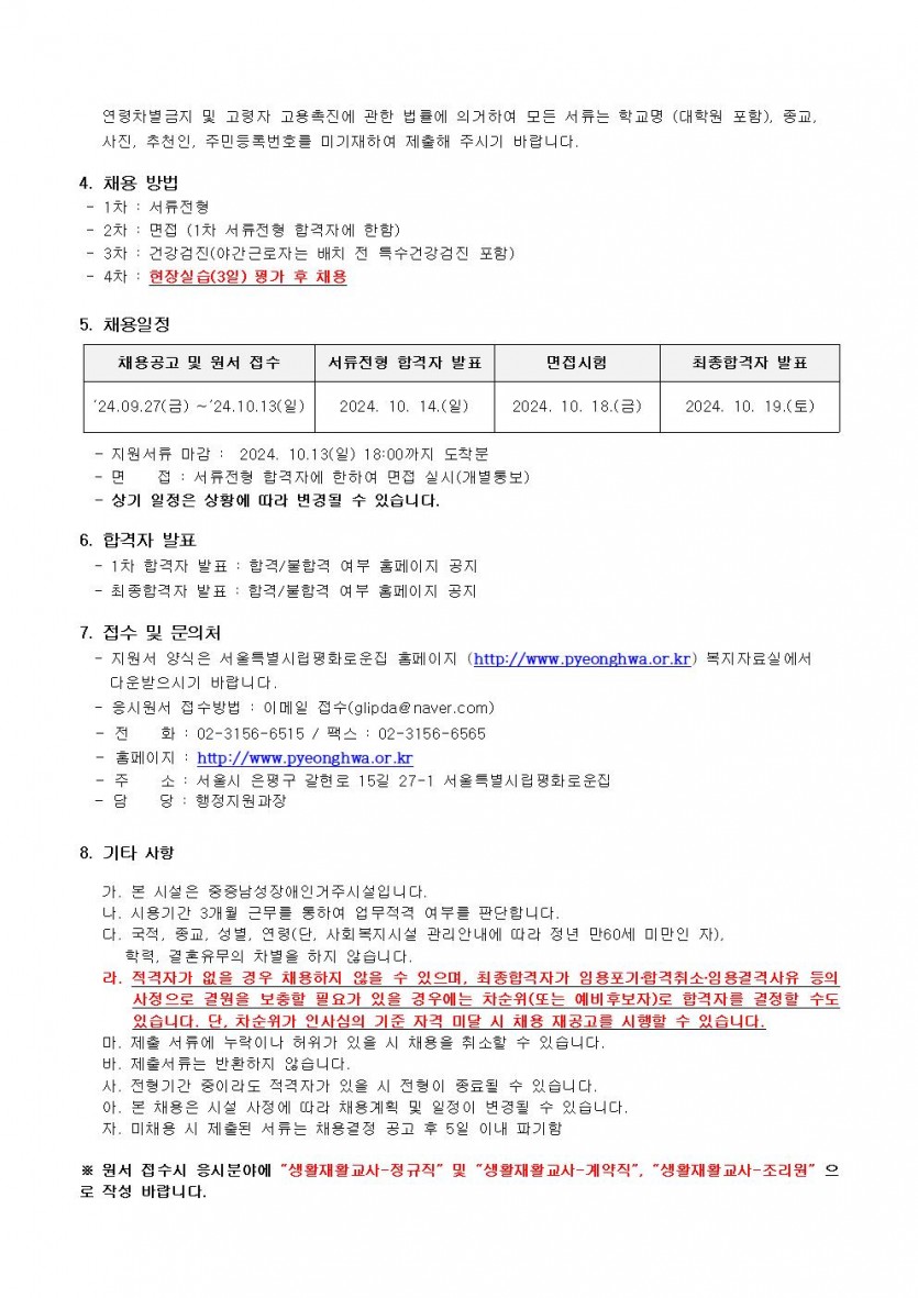 평화로운집 제10차 직원채용공고 페이지 정보 작성자 한동주 작성일 24-09-27 17:36 조회 17,510회 댓글 0건 첨부파일 파일 2024년-생활지도원 10월.hwp (36.5K) 108회 다운로드 DATE : 2024-09-27 17:36:34 파일 시립평화로운집 입사지원서이력서,자기소개서및개인정보동의서.hwp (22.5K) 80회 다운로드 DATE : 2024-09-27 17:36:34 본문 이전글 다음글 목록 답변