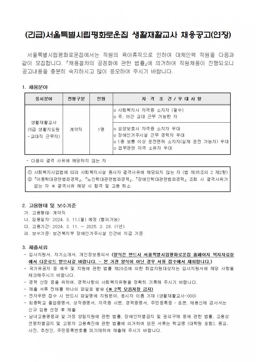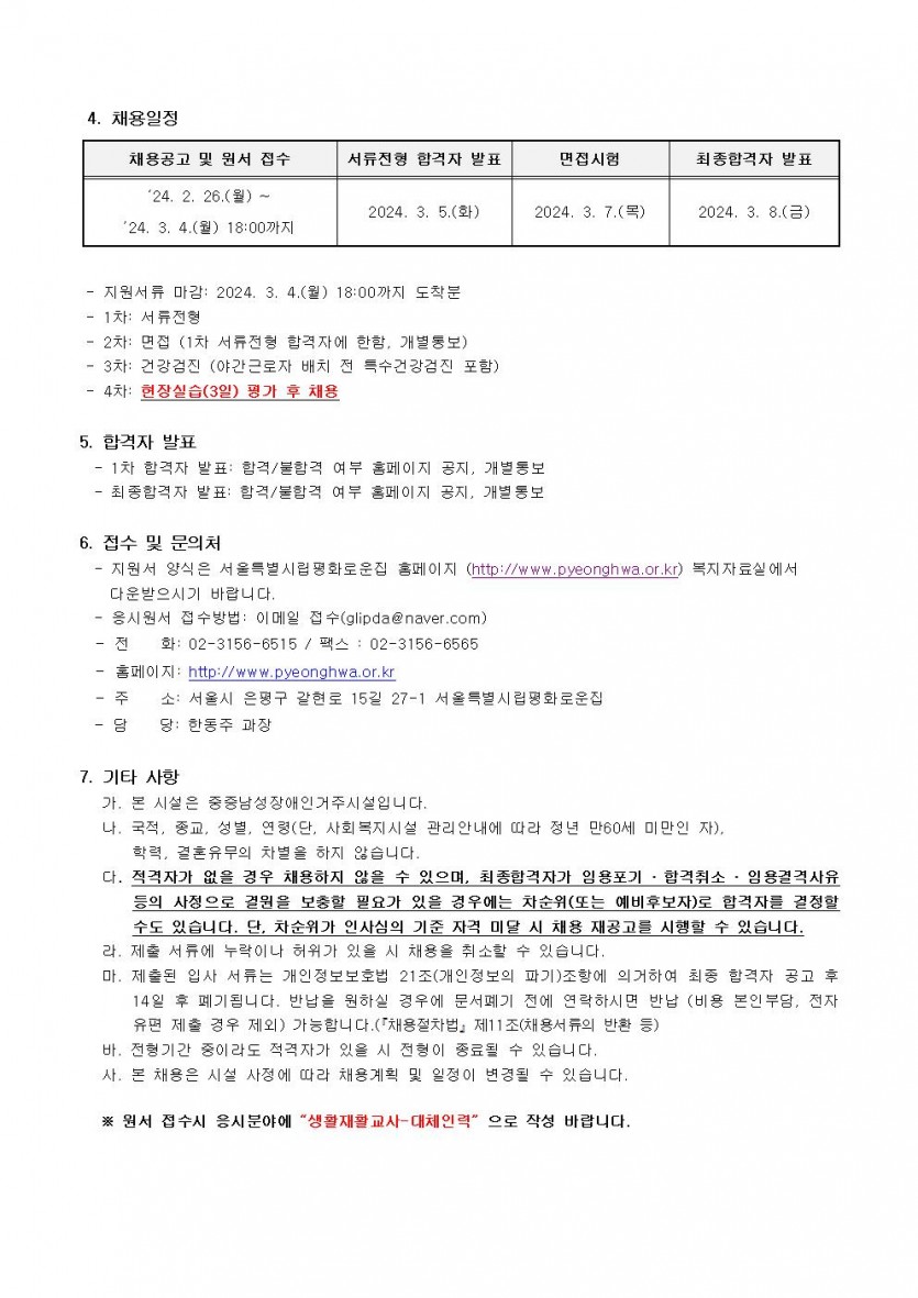 (긴급)서울특별시립평화로운집 생활재활교사 채용공고(연장) 페이지 정보 작성자 한동주 작성일 24-02-26 14:43 조회 20,162회 댓글 0건 첨부파일 파일 시립평화로운집 입사지원서이력서,자기소개서및개인정보동의서.hwp (22.5K) 143회 다운로드 DATE : 2024-02-26 14:43:58 본문 이전글 다음글 목록 답변