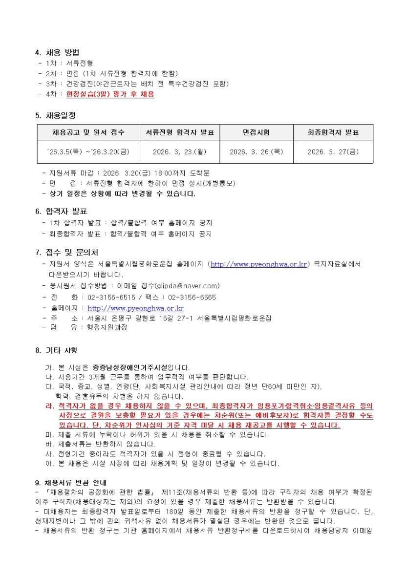 평화로운집 2026년 1차 직원채용공고 페이지 정보 작성자 한동주 작성일 26-03-05 16:17 조회 763회 댓글 0건 첨부파일 파일 2026년 1차 생활지도원.pdf (68.3K) 20회 다운로드 DATE : 2026-03-05 16:49:51 파일 시립평화로운집 입사지원서이력서,자기소개서및개인정보동의서.hwp (54.0K) 16회 다운로드 DATE : 2026-03-05 16:17:33 본문 이전글 다음글 목록 답변