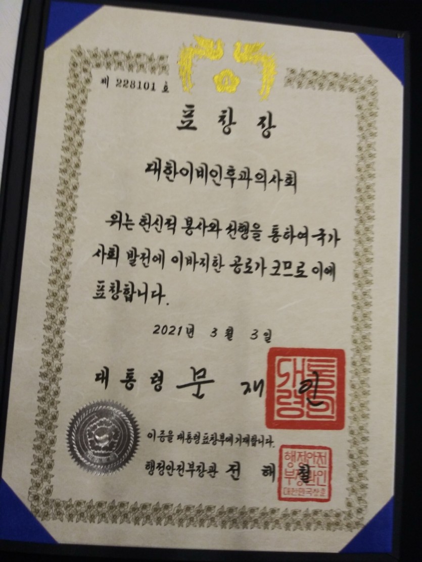 후원자·봉사자 이야기 | 대한이비인후과 의사회 대한민국 국민포상 대통령표창 수상 페이지 정보 작성자 한동주 작성일 21-03-19 09:55 조회 12,266회 댓글 1건 본문 평화로운집 개원이후 지속적으로 의료봉사활동을 하고 계시는 대한이비인후과의사회에서 올해 3월3일 대한민국 국민포상 대통령표창을 수상하였습니다. 오랜기간 본원의 장애인들을 위해 봉사해주신 대한이비인후과의사회 여러분들께 진심으로 감사와 축하말씀드립니다. 댓글목록 박성호님의 댓글 박성호 작성일 21-03-19 13:08 축하드립니다! 축하드립니다! 이전글 다음글 목록