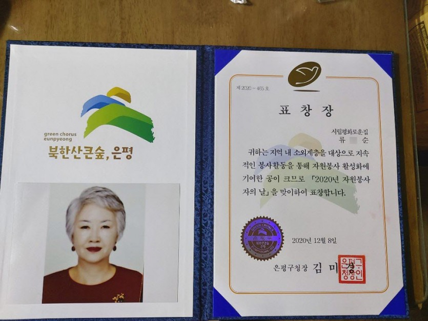 후원자·봉사자 이야기 | 우수자원봉사자 류0순 봉사자님 은평구청장 표창장 축하드립니다! 페이지 정보 작성자 박성호 작성일 20-12-14 18:11 조회 13,185회 댓글 0건 본문 - 은평구청장 표창장 우수자원 봉사자 류O순2011년 부터 시립평화로운집을 위해 아낌없이 봉사활동을 해주신 류O순 봉사자님 께서 2020년 은평구 우수자원봉사자 표창을 수여 받았습니다!! 진심으로 축하 드립니다^^ 앞으로도 평화로운집을 위해 많은 활동 부탁드리겠습니다. 감사합니다. 이전글 다음글 목록