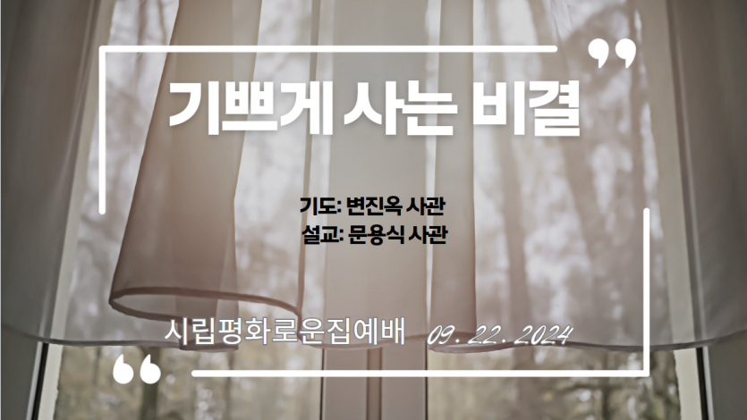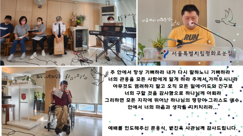 거주인 이야기 | 09.22. 주일 성결 예배 페이지 정보 작성자 장설궁 작성일 24-09-22 15:16 조회 7,227회 댓글 0건 본문 "주 안에서 항상 기뻐하라 내가 다시 말하노니 기뻐하라"기쁘게 사는 비결 정직함을 잃어버리지 마시고, 지난 과오는 잊어버리시고 하나님은 우리의 지난 과오는 기억하지 않으시니..문용식 사관님께서 전해주신 말씀처럼 스스로 자기 삶에 만족하고항상 기뻐하시기를 바라겠습니다~예배를 인도해주신 문용식, 변진옥 사관님 감사합니다. 이전글 다음글 목록