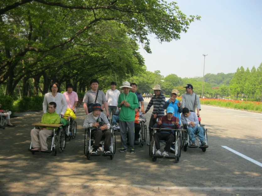 휠체어 이동이 편리한 도로 변 주변으로 벚나무, 중앙에 화초 양귀비 꽃들과 나들이 나온
