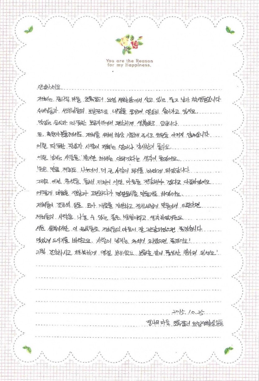 꿈나무마을에서 날아온 따뜻한 편지한장 페이지 정보 작성자 이상목 작성일 15-11-02 15:10 조회 9,494회 댓글 0건 첨부파일 본문 2015년 추석을 앞두고...저희 가족분들이 후원을 하는 꿈나무마을 학생들에게 한통의 감사편지가 들어왔습니다.아무리 장애를 가지고 있다해도 마음만큼은 늘 따뜻하고 정이 많으신 우리 가족 여러분들.고맙습니다~~우리 가족분들의 따뜻함을 여러분들과 함께 나누고 싶습니다. 이전글 다음글 목록