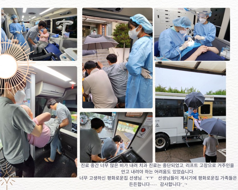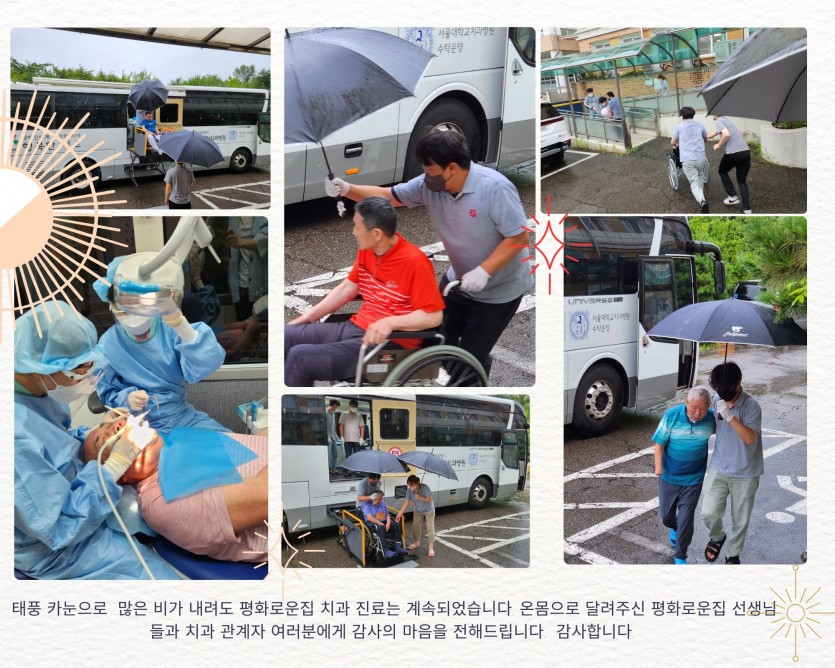 거주인 이야기 | 0810 2차 치과진료 페이지 정보 작성자 장설궁 작성일 23-08-10 17:53 조회 9,104회 댓글 1건 본문 태풍 카눈이 북상하며 많은 비가 내리는 가운데 장애인치과병원 2차 진료가 진행되었습니다. 의료진과 평화로운집 선생님들에게 다시 한번 감사의 마음을 전합니다."감사합니다" 태풍의 영향으로 강풍과 폭우가 예상된다고 합니다. 태풍으로 인한 피해 없도록 조심하세요무사히 태풍이 지나가기를 바랍니다. 댓글목록 조윤기님의 댓글 조윤기 작성일 23-08-18 19:26 비가 오는 가운데 모두 수고 많으셨습니다 비가 오는 가운데 모두 수고 많으셨습니다 이전글 다음글 목록