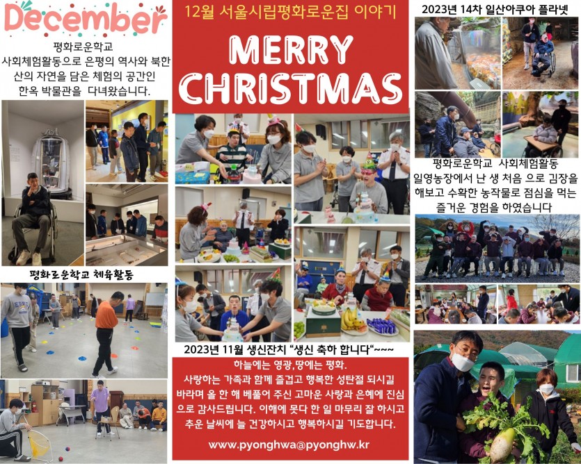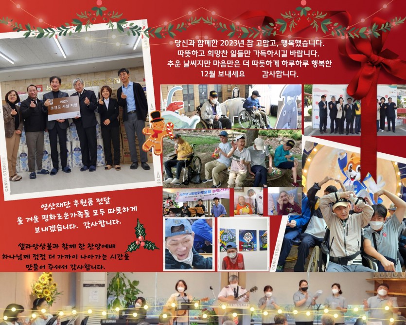 2023년 12월 후원 감사편지 페이지 정보 작성자 장설궁 작성일 23-12-11 10:58 조회 7,347회 댓글 0건 본문 12월 평화로운집 가족들 이야기어느덧 한 해를 마무리하는 12월이 되었습니다. 마음 따뜻하고 미소 지을 일이 많은 한 달이 되셨으면 합니다. 연말이라 바쁘신 일들이 많겠지만 남은 한 달 후회 없도록 마무리 잘하시고 뜻하신 일 모두 이루시길 바랍니다. 평화로운집 가족만의 행복이 아닌 모든 이들이 행복한 연말연시를 보내시길 기도하겠습니다. 좋은 사람들과 함께한다는 것은 참 행복한 일인 것 같습니다. 올 한 해 동안 후원자님들과 함께해서 행복하고 감사했습니다. 이전글 다음글 목록