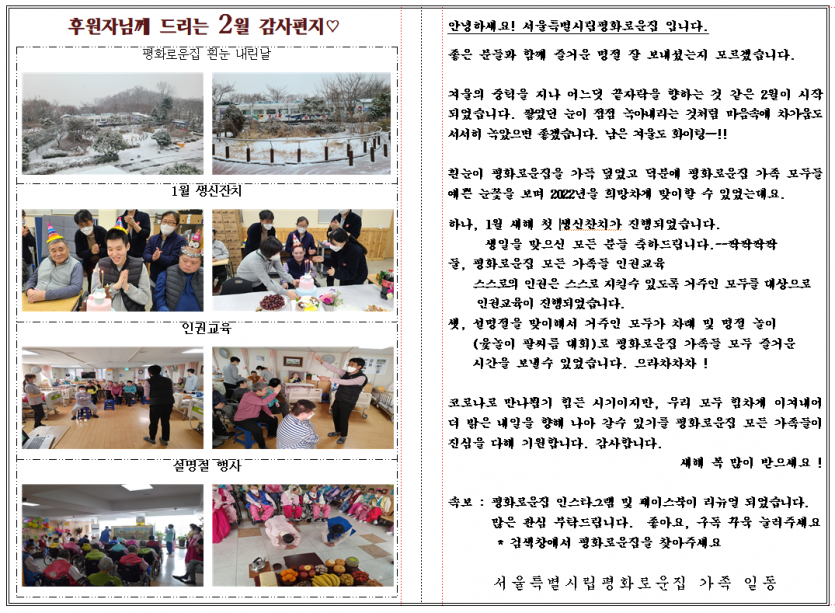 2022년 2월 후원자 감사편지 페이지 정보 작성자 김동현 작성일 22-02-07 14:21 조회 12,951회 댓글 0건 본문 2022년 2월, 겨울이 지나가고 봄이 오고 있습니다.항상 평화로운 집과 함께해주시는 후원자님들께감사의 편지를 올립니다. 이전글 다음글 목록