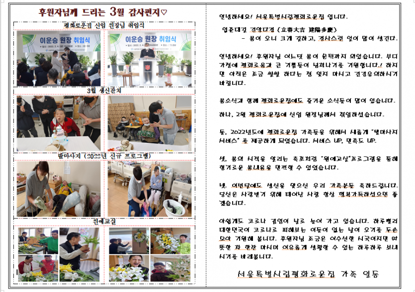2022년 3월 후원자 감사편지 페이지 정보 작성자 장설궁 작성일 22-07-08 13:10 조회 12,028회 댓글 0건 본문 ♧ 그 어느 해보다 바쁘고 힘겨웠던 겨울을 보낸 뒤 그 어느 해처럼 반갑게만 느껴왔던 봄을 맞이하였습니다. 포근한 햇살에 포근한 봄바람을 실어 평화로운집 식구들의 소식을 전해드립니다~~~ ♧ 이전글 다음글 목록
