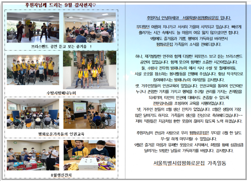 2022년9월후원자감사편지 페이지 정보 작성자 장설궁 작성일 22-09-14 10:51 조회 11,515회 댓글 0건 본문 두 번 오는 하루는 없습니다.반복되는 하루 같지만 같은 날은 단 한 번도 없습니다.오늘 하루를 아낌없이 사랑하고 후회 없이 살아가고즐겁고 행복하게 쓰시길 바랍니다.날마다 멋진 하루 보내세요~~ 이전글 다음글 목록