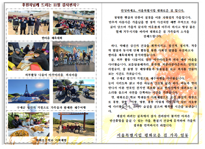 2022년 11월 후원감사편지 페이지 정보 작성자 장설궁 작성일 22-11-06 13:22 조회 10,976회 댓글 0건 본문 벌써 11월이네요.가을이 점점 깊어갑니다.화려했던 단풍들도 이제 낙엽이 되어 떨어지기 시작합니다.수북히 쌓인 낙엽길도 걸어보시면서..여유롭게 보내시면 좋겠습니다.11월도 건강하시고,하시는 모든일에 행운과 행복이 가득하시길 바랍니다.아자!아자! 화이팅! 이전글 다음글 목록