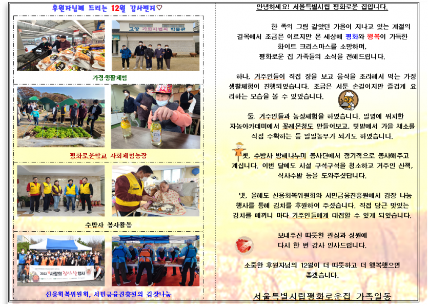 2022년 12월 후원감사편지 페이지 정보 작성자 장설궁 작성일 22-12-08 13:00 조회 10,884회 댓글 0건 본문 어느덧 2022년 한해를 마무리하는 마지막 달 12월이 되었습니다. 우리가 함께 해서 너무나 행복한 시간들 이었습니다.남은 시간을 아쉬워 하기보다는 채워가는 12월 보내시길 바랍니다. 소리 없이 세상을 하얗게 물들이는 하얀 눈처럼 조용히 찾아오는 일상에서 평온함이 가득하길 기원합니다. ♡ 이전글 다음글 목록