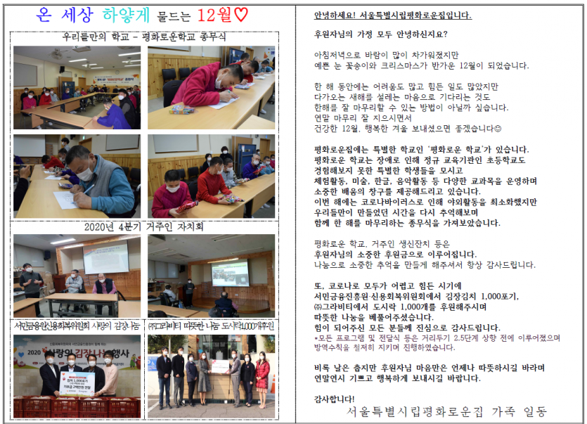 2020년 12월 후원자 감사편지 페이지 정보 작성자 박상은 작성일 21-01-21 13:38 조회 14,151회 댓글 0건 본문 2020년 12월, 크리스마스 캐롤 울려퍼지는 설레는 겨울에 늘 나눔으로 함께해주시는 후원자님께감사의 편지를 올립니다. 이전글 다음글 목록