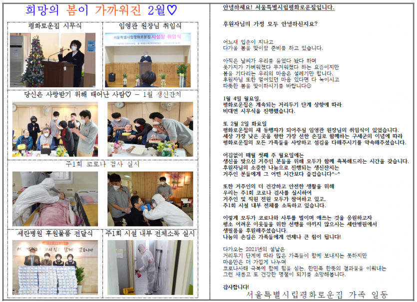 2021년 2월 후원자 감사편지 페이지 정보 작성자 박상은 작성일 21-02-06 17:02 조회 13,827회 댓글 0건 본문 2021년 2월, 어느새 봄이 다가오고 있습니다.늘 나눔으로 함께해주시는 후원자님께감사의 편지를 올립니다. 이전글 다음글 목록