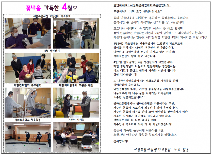 2021년 4월 후원자 감사편지 페이지 정보 작성자 박상은 작성일 21-04-07 09:40 조회 14,319회 댓글 0건 본문 2021년 4월, 활짝 핀 꽃들의 아름다움처럼 빛나는 후원자님의 나눔에 감사드립니다.늘 나눔으로 함께해주시는 후원자님께감사의 편지를 올립니다. 이전글 다음글 목록