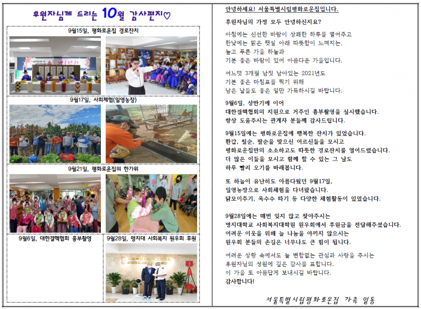 2021년 10월 후원자 감사편지 페이지 정보 작성자 박상은 작성일 21-11-18 10:04 조회 12,640회 댓글 0건 본문 청량한 하늘이 아름다운 10월,후원자님께 감사의 편지를 올립니다. 이전글 다음글 목록