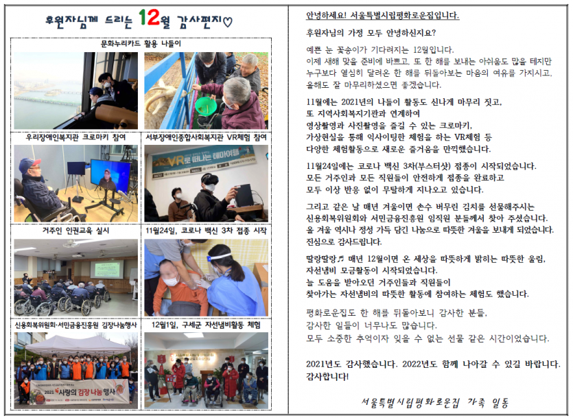 2021년 12월 후원자 감사편지 페이지 정보 작성자 박상은 작성일 22-01-05 17:31 조회 12,519회 댓글 0건 본문 크리스마스캐롤 울려퍼지는 아름다운 겨울입니다.12월, 후원자님께 감사의 편지를 올립니다. 이전글 다음글 목록