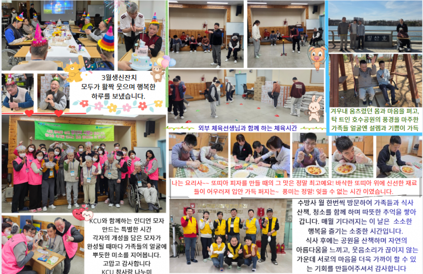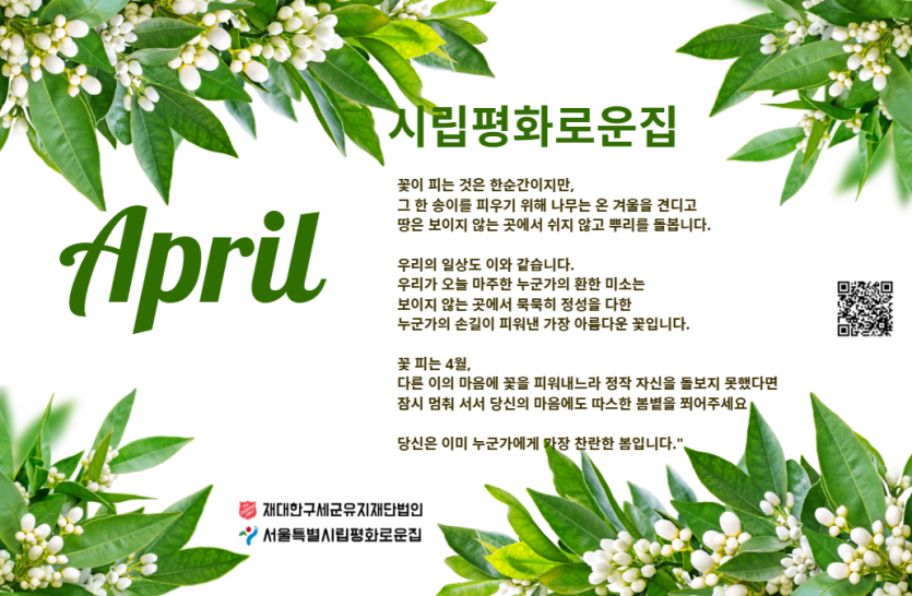 2026년 시립평화로운집 4월 후원감사편지 페이지 정보 작성자 장설궁 작성일 26-04-01 16:51 조회 34회 댓글 0건 본문 꽃보다 아름다운 마음을 나누어 주시는 후원자님께 감사드립니다. 후원자님의 나눔은 우리 거주인 분들에게 따뜻한 밥 한 끼가 되고, 깨끗한 보금자리가 되며, 내일을 살아갈 희망이 됩니다.보내주신 사랑에 보답하기 위해 오늘도 저희는 정성을 다해 거주인 분들을 모시겠습니다. 기분 좋은 봄바람처럼 늘 행복한 일들만 가득하세요! 다음글 목록