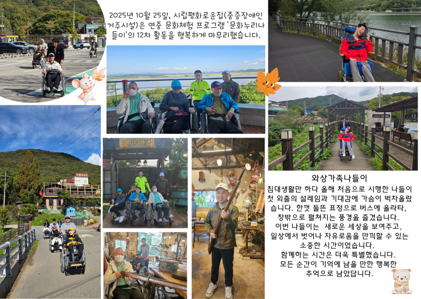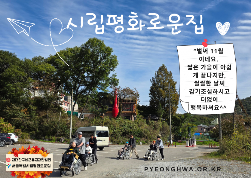 2025년 시립평화로운집 11월 후원감사편지 페이지 정보 작성자 장설궁 작성일 25-11-11 16:11 조회 1,444회 댓글 0건 본문 11월은좋은 일들은 1과 1사이에 +가 돼서2배가 되고나쁜 일들은 1과 1사이에 -가 돼서0이 됐으면 좋겠다.가을 하늘 아래선아무 이유 없이 기분이 좋아지지 않나요?커피 향 속에서마음도 조금 더 따뜻해졌으면 해요 이전글 다음글 목록
